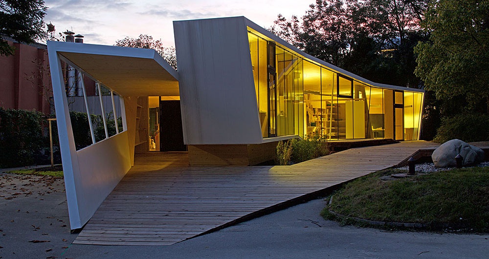 Entstanden ist ein pavillonartiges Werkstättengebäude, das nicht nur den Kindern und Jugendlichen als NutzerInnen ein optimales Raumangebot bietet, sondern auch den Park durch seine einzigartige Architektur bereichert. Vorgelagerte Terrassen und raumhohe Glasfronten verbinden den geschwungenen Baukörper mit der Umgebung, im Inneren bilden schräge Böden und Wände ein fließendes Kontinuum an Räumen mit unterschiedlichen Atmosphären und Arbeitsmöglichkeiten.
