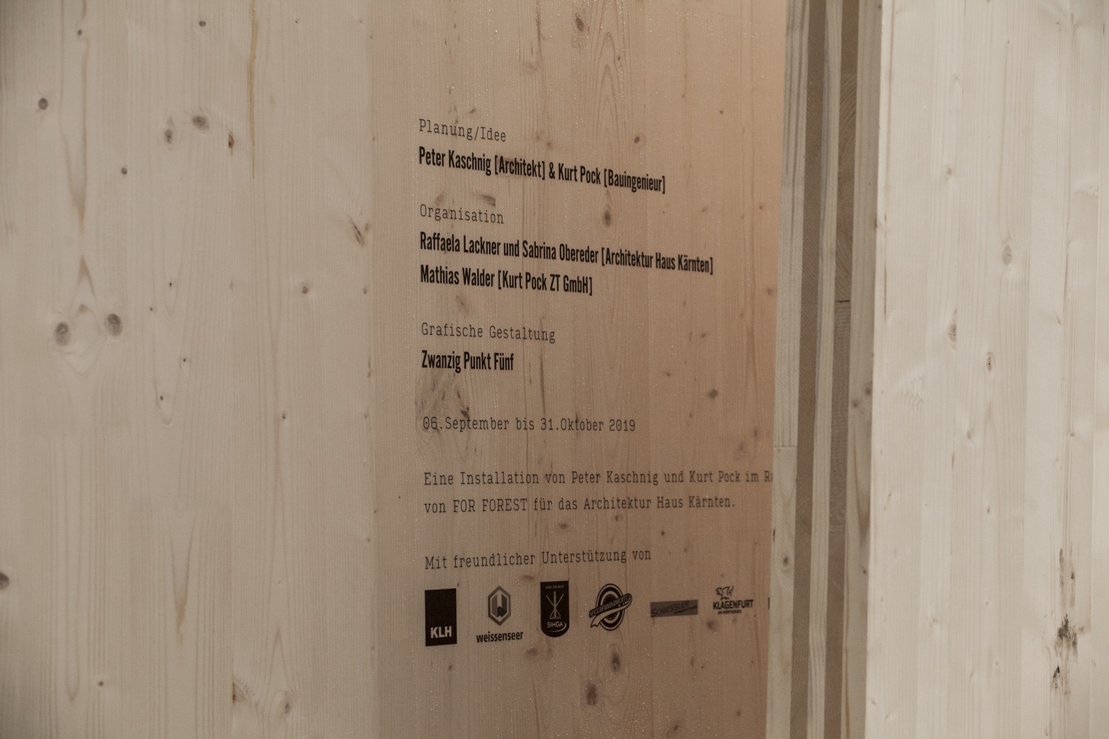 Eine raumgreifende Holz-Installation von Peter Kaschnig und Kurt Pock vor dem Architektur Haus Kärnten zieht interessierte vom Außen- in den Innenraum und lässt neue Blickwinkel zu. Holz wird zum Ausstellungsstück und zeigt was es kann. Zur Langen Nacht der Museen wird zum Außenraum auch der Innenraum bespielt und ein Kinderworkshop lädt die BesucherInnen ein kreativ zu werden.