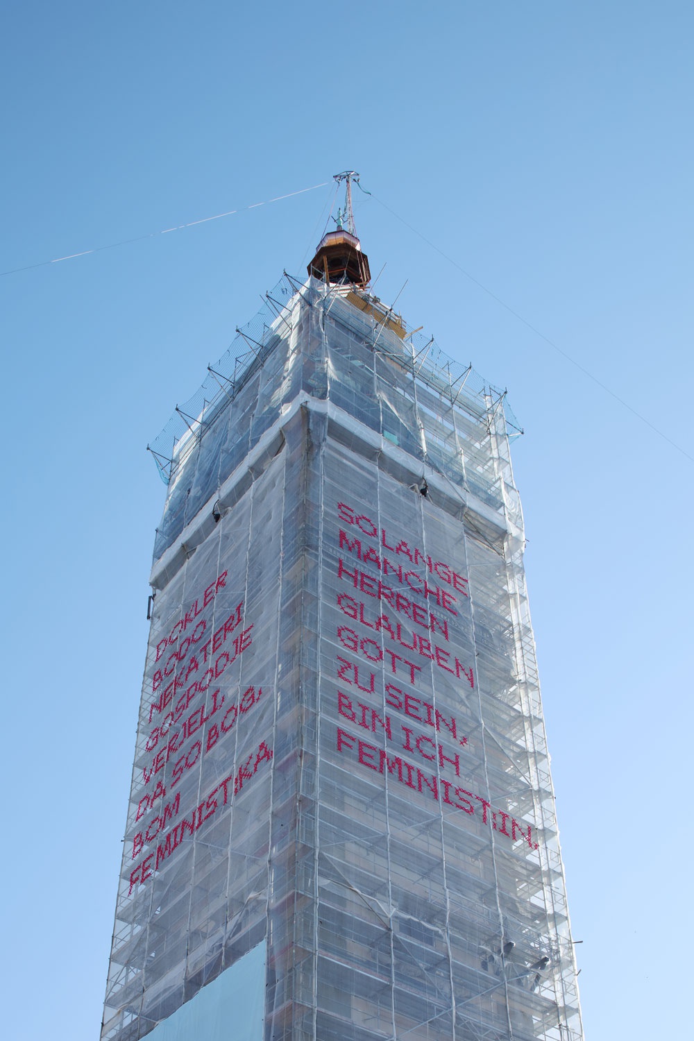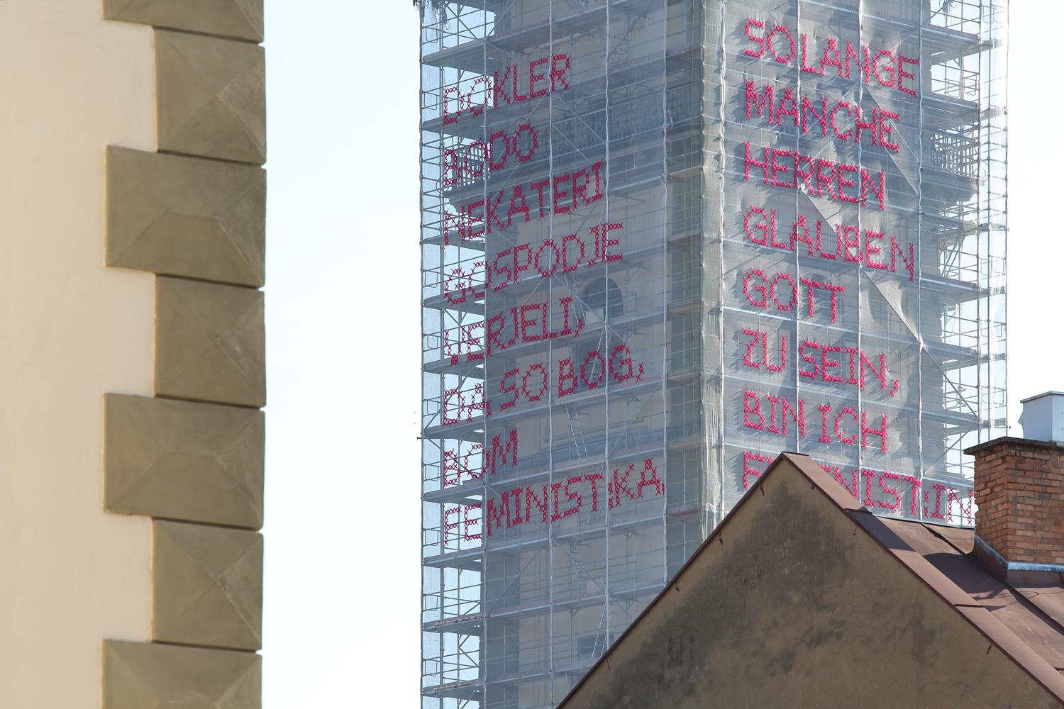 Bereits mehr als 17 mit Kabelbinder und Tüll per Hand bestickte Staubschutznetzte wurden national und international (u.A. auf der Biennale in Rabat, Marokko) auf Baustellen montiert und nun ist eine Solange-Kunstintervention von Katharina Cibulka auch in Kärnten zu sehen. Die großformatigen, im traditionellen Kreuzstich gestickten Sätze, verdeutlichen die anhaltende Notwendigkeit feministischer Forderungen. Die Themenbereiche der Solange-Sätze werden aus zahlreichen Gesprächen rund um das Thema Feminismus mit den beteiligten und betroffenen Akteur*innen vor Ort entwickelt. Könnte diese Intervention im öffentlichen Raum manche Herren dazu inspirieren ihr Verhalten zu ändern? Wielange sind SIE schon / noch Feminist:in?
