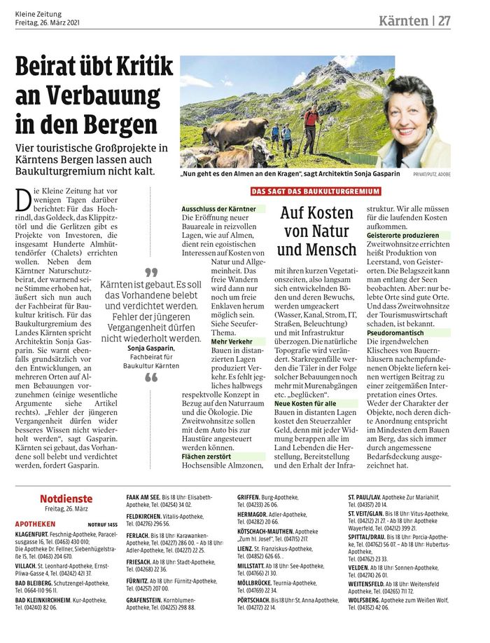 Kleine Zeitung: „Beirat übt Kritik an Verbauung in den Bergen"