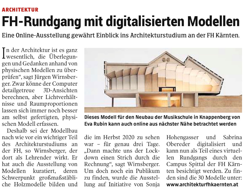 Deshalb sei der Modellbau nach wie vor ein wichtiger Teil des Architekturstudiums an der FH, so Wirnsberger, der dort als Lehrender wirkt. Er hat auch die Ausstellung von Modellen kuratiert, deren Schwerpunkt großmaßstäbliche Holzmodelle bilden und die im Herbst 2020 zu sehen war – für genau drei Tage. „Dann machte uns der Lockdown einen Strich durch die Rechnung“, sagt Wirnsberger. Um doch noch ein Publikum zu finden, wurde die Ausstellung auf Initiative von Sonja Hohengasser und Sabrina Obereder digitalisiert und kann nun als Teil eines virtuellen Rundgangs durch den Campus Spittal der FH Kärnten besichtigt werden. Zu finden sind die 30 Modelle unter: www.architekturfhkaernten.at