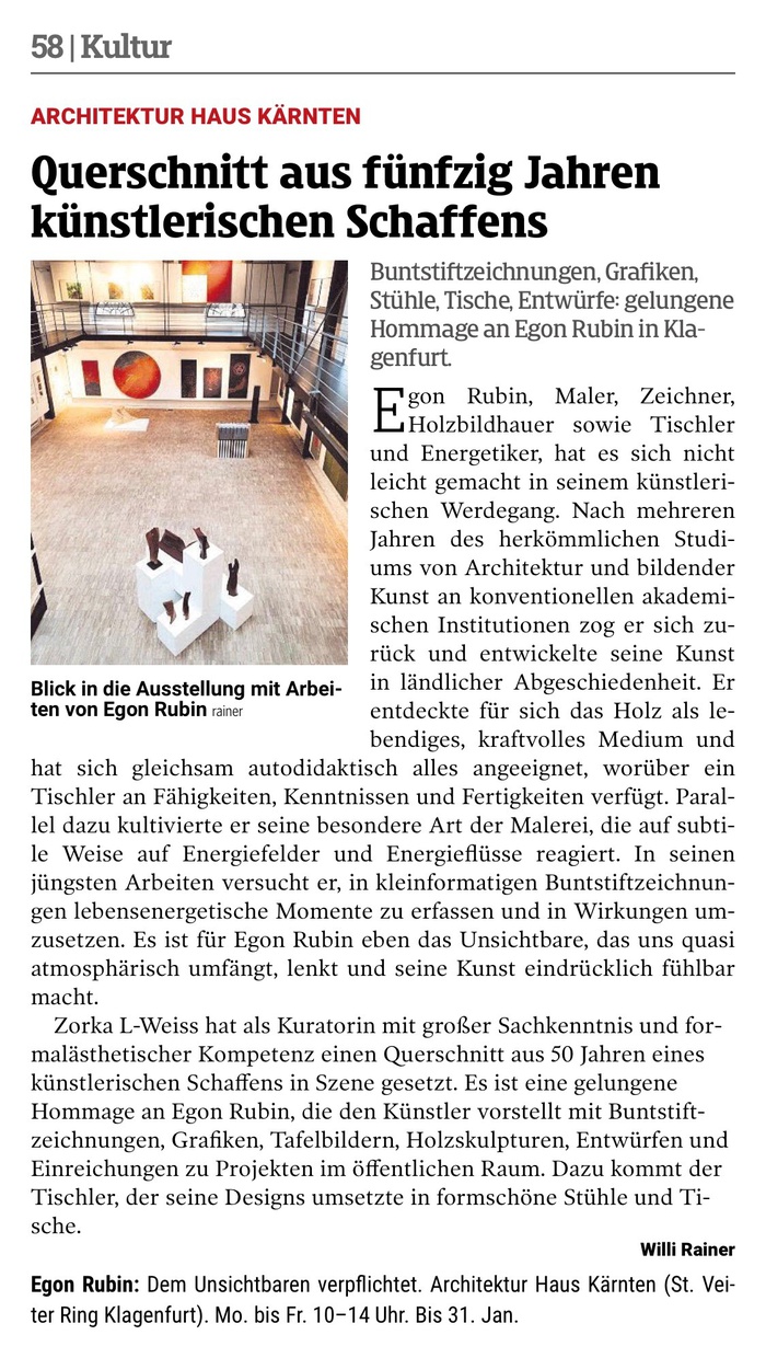 Zorka L-Weiss hat als Kuratorin mit großer Sachkenntnis und formalästhetischer Kompetenz einen Querschnitt aus 50 Jahren eines künstlerischen Schaffens in Szene gesetzt. Es ist eine gelungene Hommage an Egon Rubin, die den Künstler vorstellt mit Buntstiftzeichnungen, Grafiken, Tafelbildern, Holzskulpturen, Entwürfen und Einreichungen zu Projekten im öffentlichen Raum. Dazu kommt der Tischler, der seine Designs umsetzte in formschöne Stühle und Tische. (Artikel: Willi Rainer)
