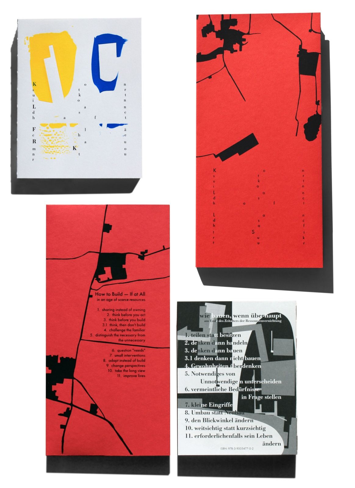 Jedes Exemplar des Buches „Konstruktion Landschaft, Fläche | Raum | Kontur“ hat einen individuellen Siebdruck am Cover (300 nummerierte Unikate), das Buch „Konstruktion Landschaft, Landschaft | Struktur“ ist von Hand geheftet, der Umschlag wurde im Siebdruckverfahren bedruckt.