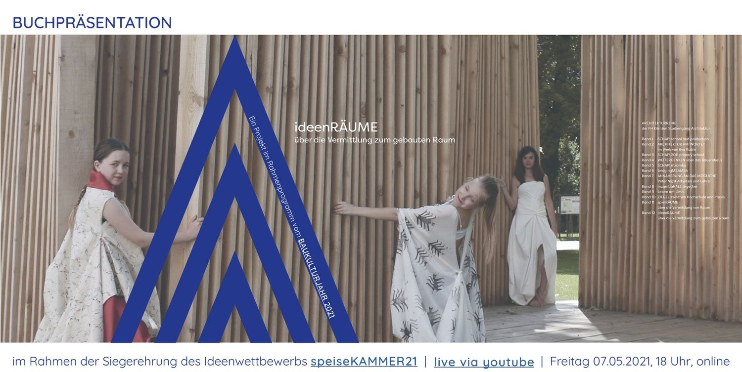 Band 12 ideenRÄUME - über die Vermittlung zum gebauten Raum setzt sich mit dem Stellenwert des Wettbewerbs in der Architektur auseinander und beinhaltet eine Dokumentation der vom Studienbereich Bauingenieurwesen & Architektur der FH Kärnten ausgelobten Ideenwettbewerbe für Schüler*innen von HTLs und Bachelorstudierende. Dieser ist heuer zum zehnten Mal ausgerufen worden. Unter dem Titel „speiseKAMMER21- regionaler Genuss“ werden nach Nahversorgerboxen aus Holz gesucht.