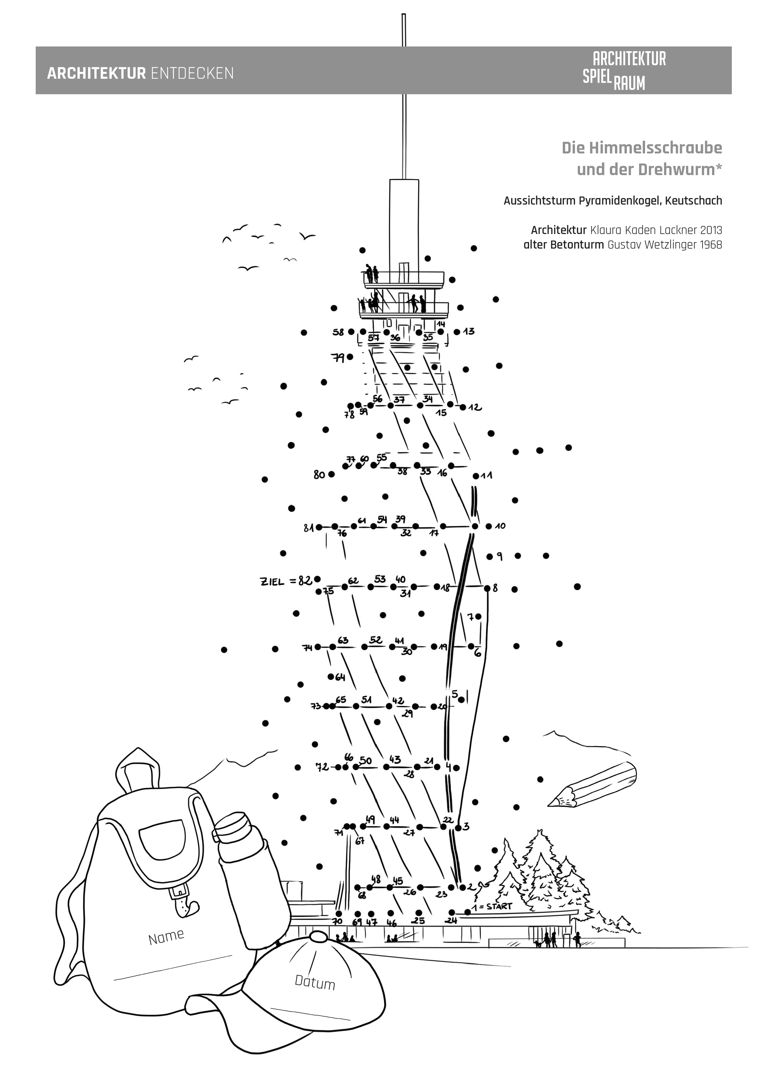 Die Arbeitsblätter können als Vermittlungsinstrument in Schulen und baukulturellen Institutionen eingesetzt werden und sollen zum Besuch der jeweiligen Bauwerke anregen. Die ansprechend gestalteten Karten laden Baukulturvermittler*innen, Jugendliche, Kinder, Pädagog*innen und Schulklassen zum Mitmachen ein: Kurze geschichtliche Informationen zur Entstehung des Bauwerks, Besonderheiten, Materialkunde und interessante Eckdaten wechseln sich mit konkreten Fragestellungen und Hinweisen auf weiterführende Literatur ab. Ein spannendes Punkt-zu-Punkt Bild ermöglicht es, das Bauwerk auch mit dem Stift zu „entdecken“ und die Scheu vor dem Selber-Zeichnen zu überwinden.