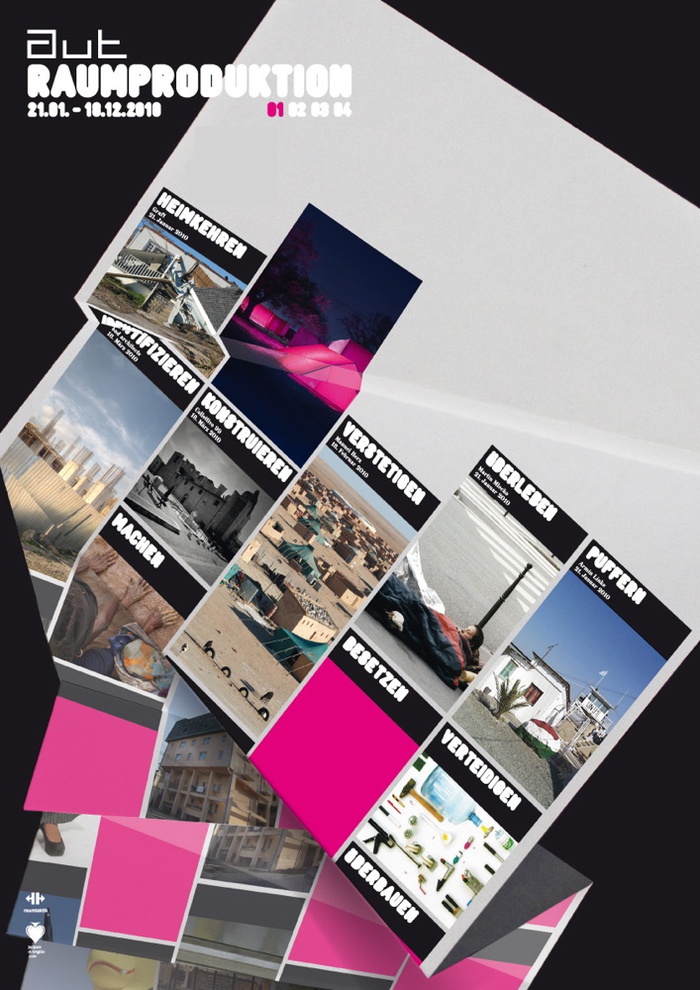 Im aut gibt es 2010 nur eine Ausstellung. Oder auch ganz viele. Jeden Monat werden einzelne Räume neu bespielt. Gezeigt werden verschiedene Positionen von ArchitektInnen, KünstlerInnen und AktivistInnen, die sich mit Handlungsweisen der Raumproduktion auseinandersetzen und so wieder ein Handeln ermöglichen. Jeder neu bespielte Raum, jeder neue Beitrag bringt einen neuen Begriff, ein neues Verb in eine Begriffskette. Diese Kette, bestehend aus Verben der Raumproduktion, macht immer wieder einen neuen Sinn und führt - als verbindendes Rückgrat - durch das gesamte Jahr.