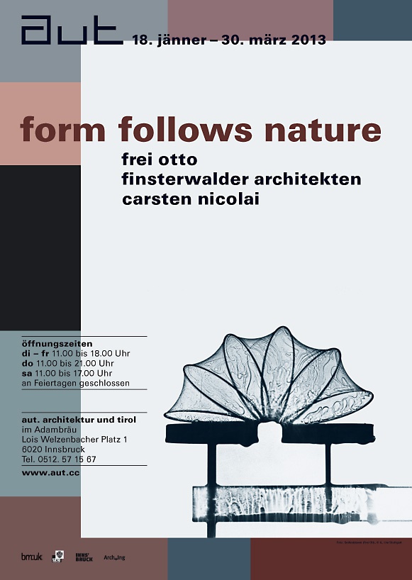 Die Gestaltung der 2011 erstmals bei Aedes Berlin und nun in adaptierter Form im aut gezeigten Ausstellung „Form Follows Nature“ transportiert das Konzept des naturwissenschaftlichen Arbeitens, das Frei Otto, Finsterwalder Architekten und Carsten Nicolai verbindet. Wie in einem Archiv werden die Modelle und Skulpturen in Stahlregalen präsentiert, Karteikästen mit Plänen, Bildern und Texten laden zum intensiven Studieren und Forschen ein.