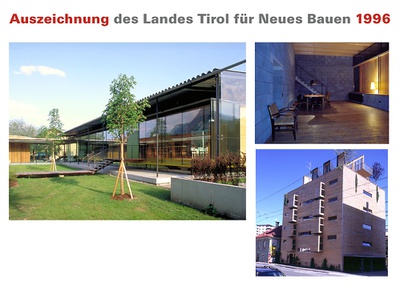 Bei der „Auszeichnung des Landes Tirol für Neues Bauen 1996“ kam die Jury zur Entscheidung, den Preis des Landes Tirol für Neues Bauen 1996 an Erich Gutmorgeth zu vergeben und Anerkennungen an Rainer Köberl sowie an die Architektengemeinschaft Armin Kattan, Martin Schranz und Erich Strolz auszusprechen.