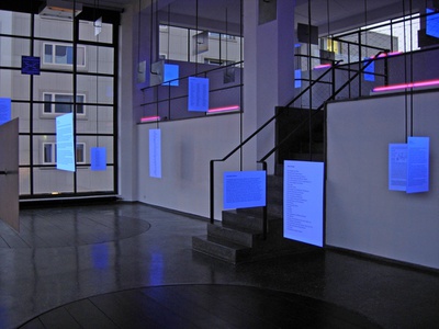 Ein von Andreas Uebele aus Innsbrucks "Schriftraum" – den an Bauten vorgefundenen Beschriftungen, Logos, Schildern und Hinweistafeln – destilliertes Alphabet, das als raumübergreifende Installation präsentiert wird.