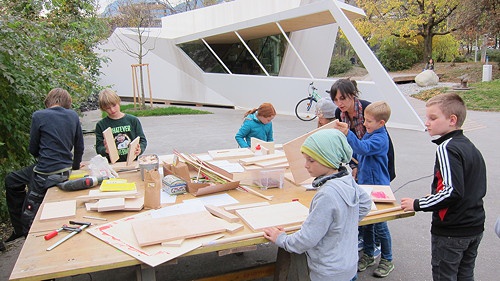 Was ist es nun geworden, worin sich die Kunst- und Architekturschule für Kinder und Jugendliche sesshaft macht? Die Stadt Innsbruck hat dem Projekt bilding eine Fläche am südlichen Rand des zentrumsnahen Rapoldiparks zur temporären Bebauung zur Verfügung gestellt, vorerst für fünf bis sieben Jahre. Der Platz hat die richtige Ambivalenz aus Öffentlichkeit und Privatheit, ist Teil des Parks aber doch abseits genug um nicht permanent unter Beobachtung zu stehen. Der Weg zum heute realisierten Entwurf war kein geradliniger. Von einem recycelten Glashaus über die wandelbare Holzbox bis zu einem kollektiven Entwurfsprozess wurde vieles angedacht und verworfen, bis zuletzt eine Kooperation mit der Architekturfakultät und dem dortigen ./studio3 das Projekt als 1:1 Bachelorarbeit einer Gruppe von insgesamt 27 Studierender realisierbar machte. Diese errichteten gemeinsam mit professionellen Handwerkern in drei Monaten dieses besondere Werkstattgebäude, das fast ausschließlich über Firmen- und Privatsponsorings, durch eine Bausteinaktion und ehrenamtliche Arbeit finanziert wurde.