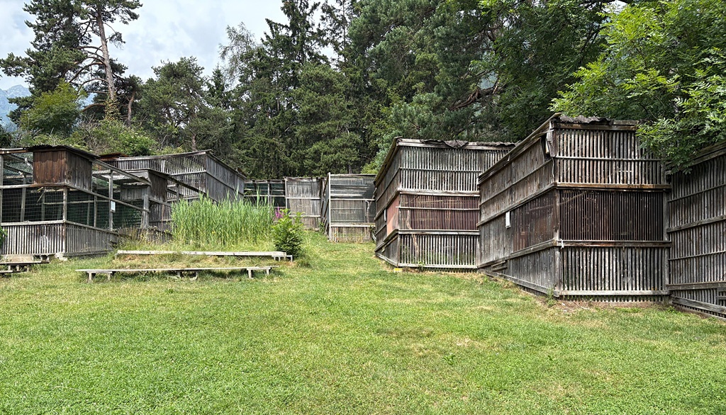 Warum diese doch recht massive Vergitterung der Volieren, wo doch überall in ähnlichen Situationen möglichst unsichtbare Netze verwendet werden? Das war eigentlich meine erste Frage an Mathias. Der Grund dafür ist die Sorge um die Gesundheit der Vögel, denn bei dünnen Stäben oder Gittern würden deren Augen auf die Ferne fokussieren, wodurch die Gefahr einer Verletzung entstünde, da Greifvögel auch auf kürzeste Distanzen hohe Fluggeschwindigkeit erreichen. Eine ähnliche Haltung um die Sorge der Tiere zeigt sich bei der Ausführung der Böden in den Käfigen, in denen, zwar aufwändiger in der Reinigung, Gras und Erde dominieren.