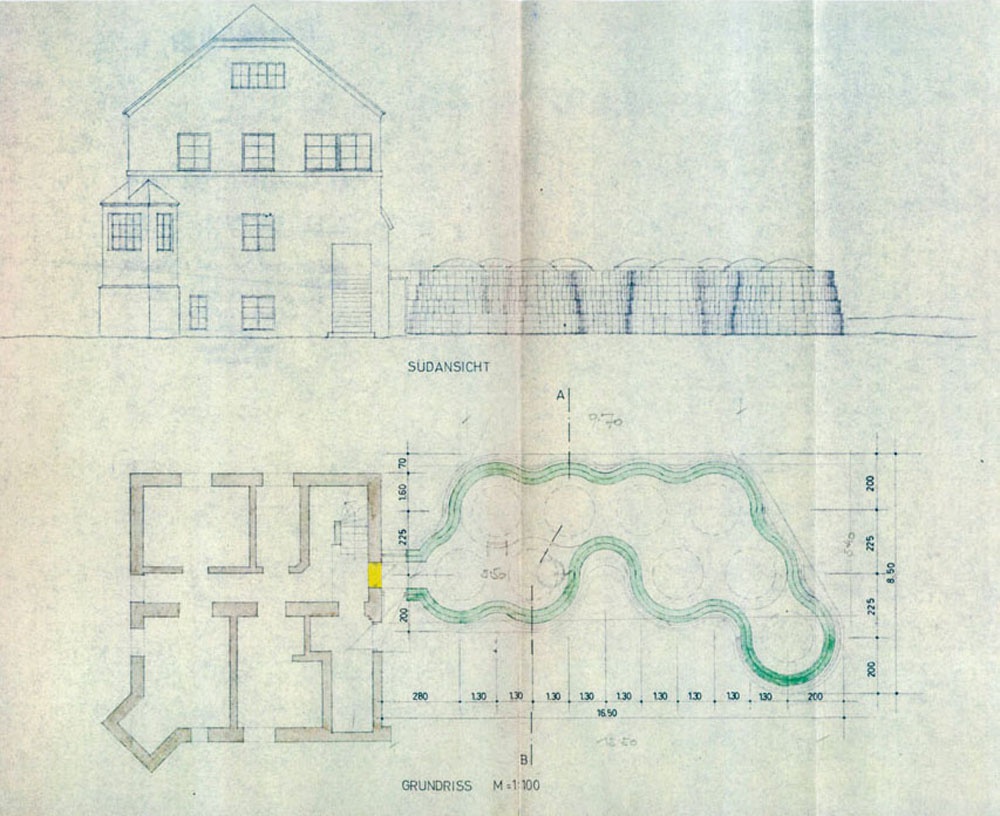 Wer weiß, in welcher Jahreszeit Josef Lackner diesen Auftrag entwickelt hat. Ich vermute fast in der unwirtlichen Winterzeit. Sein Text zum Projekt1, der wie das Bad selbst, durch seine poetische Beschreibung der Licht- und Jahreszeitenverhältnisse eine Sonderstellung in seinen Projekttexten einnimmt, reflektiert auf Höhenlage und Klima, die Art des Schwimmens und das Licht, sogar auf Sonne und Mond, Baumkronen und Farben des Himmels, aber kein Wort zur Konstruktion. Neben dem bürgerlichen, orthogonal eingeteilten, villenartigen Haus, in dem ganz oben unter Dach, nach Süden blickend, der groß gewachsene, ganz und gar nicht sportliche Paul Flora seine „Striche strichelte", entstand – skizziert aus Lackners „Pranke“ – dieses „wellige“ Gebilde im verwilderten Garten.