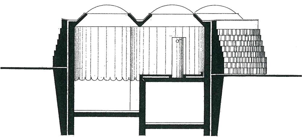 Das Projekt ist nicht, wie eigentlich alle Werke Lackners durch eine, zumindest ansatzweise, konstruktive Idee bestimmt. Hier ordnen im ersten Entwurf eine Summe von Kreiskegeln der Oberlichtkuppeln den Grundriss. Dieses bestimmende „Konzept“ wurde in der Weiterbearbeitung, wohl durch eine Überprüfung der Raumwirkung, auf den vorderen und hinteren Bereich – Einstieg und „Insel“ – beschränkt. Der Mittelteil wurde „begradigt“, wodurch der Entwurf erst seine innere Spannung und Kraft erhielt. Nur nebenbei sei hier auf die notwendige exakte Schalungsarbeit der Wände und Kegelanschlüsse der Oberlichtkuppeln hingewiesen.