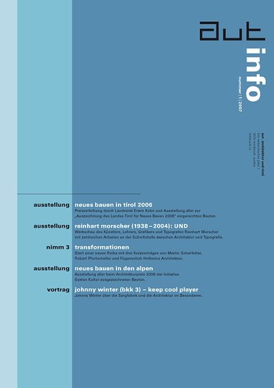 Die Ausgabe 3/07 der Programmzeitschrift aut: info mit Hintergrundinformationen zu den Ausstellungen „Wettbewerb Sternbrauerei Salzburg“ und „genius loci“ sowie zum Programm des aut zwischen Mai und Juni 2007.