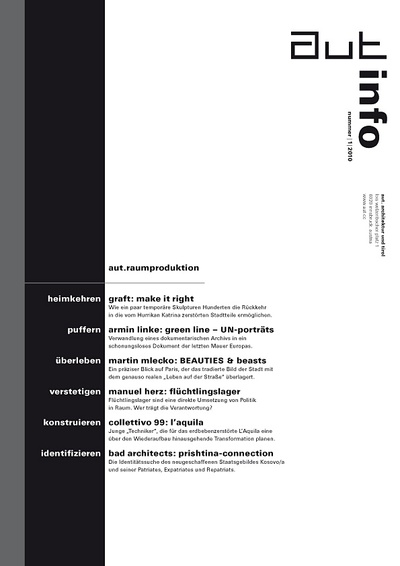 Die Ausgabe 1/10 der Programmzeitschrift aut: info mit Hintergrundinformationen zum ersten Teil der von raumtaktik kuratierten Ausstellungsreihe "aut.raumproduktion" sowie zum Programm des aut zwischen Jänner und März 2010.