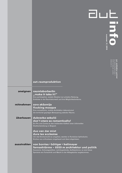 Die Ausgabe 3/10 der Programmzeitschrift aut: info mit Hintergrundinformationen zum dritten Teil der Ausstellungsreihe "aut.raumproduktion" sowie zum Programm des aut zwischen Juli und September 2010.