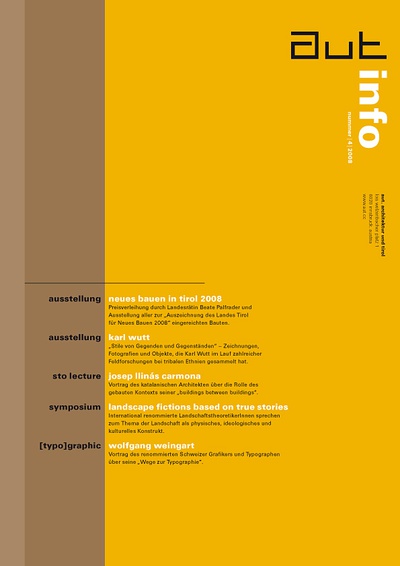 Die Ausgabe 4/08 der Programmzeitschrift aut: info mit Hintergrundinformationen zu den Ausstellungen „Neues Bauen in Tirol 2008“ und „Karl Wutt: Stile von Gegenden und Gegenständen“ sowie zum Programm des aut zwischen Oktober und Dezember 2008.