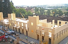 Projektvorschläge in Holzbauweise spielten hier ihre Vorteile klar aus, auch das Tiroler Unternehmen Binderholz konnte zusammen mit italienischen Partnern mehrere Aufträge akquirieren. Mittels fertig abgebundener Elemente, die teilweise inkl. aller Installationen nach Italien geliefert wurden, konnten in nur 55 Tagen schlüsselfertige Anlagen mit je 2.700 m2 Wohnfläche errichtet werden. Dreigeschossige Holzbauten sind für diese Region etwas völlig Neues. Die hohe Absorptionsfähigkeit von Erdstössen der vielen, untereinander verbundenen steifen Scheiben und das träge Brandverhalten sorgt zudem für hohe Sicherheit.