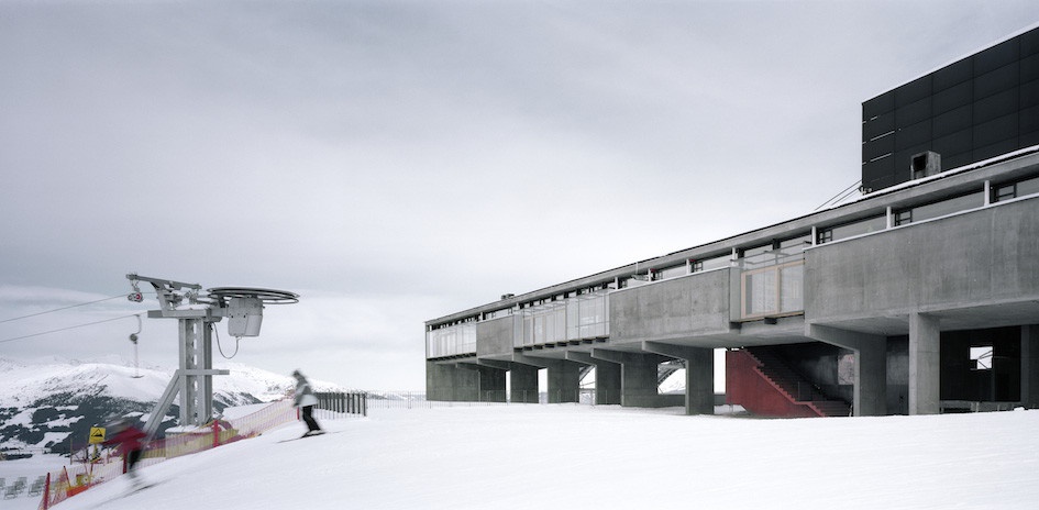 Die Kooperation zwischen Architekt und Bauherr begann einige Jahre früher mit den Stationen der Ahornbahn, dunkelgrauen Monolithen, die sich von vielen zeitgenössischen Liftanlagen unterscheiden. Nicht der hochkomplexe technologische „Inhalt“ – eine Pendelbahn, die allein durch ihre technischen Ausmaße sehr hohe Aufbauten bedingt – steht im Vordergrund, sondern der Dialog der Stationsbauten mit der Umgebung.