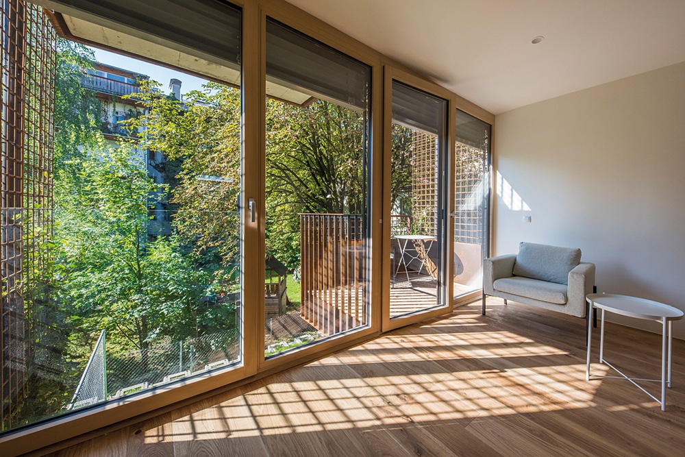 Ursprünglich befanden sich auf dem großen Innenhof zwischen Speckbacherstraße, Schöpfstraße, Andreas-Hofer-Straße und Franz-Fischer-Straße ein Parkplatz und ein Bürogebäude. Mit dem Ziel einer möglichst geringen Beeinträchtigung der Anrainer entstand der Neubau mit ca. 120 Wohnungen nach dem Konzept einer „sunken plaza“, d. h. als Verdichtung nach unten. Zwei unterirdische Wohngeschoße öffnen sich zu einem abgegrabenen Innhof, die drei Obergeschoße wurden auf mehrere einzelne Häuser mit begrünten Dächern und Fassaden verteilt. Die 1- bis 4-Zimmer-Wohnungen bieten mit gut durchdachten Grundrissen viel Platz auf wenig Raum. Jeder Einheit – von den atelierartigen Erdgeschoßwohnungen bis zu Dachgeschoßapartments mit dreiseitiger Belichtung – ist ein privater Freiraum in Form von Gartenflächen, Balkonen und Terrassen zugeordnet.