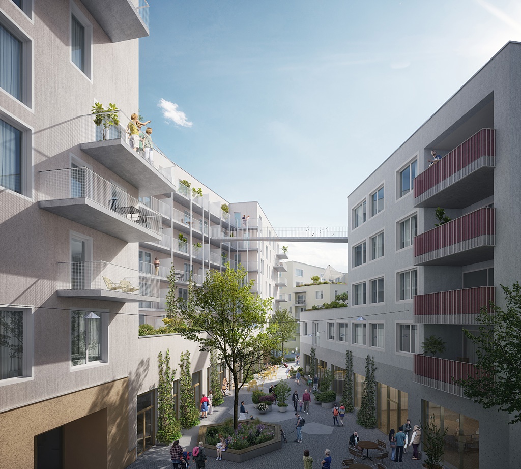 Den Wettbewerb für das erste Baufeld konnte 2017 Bogenfeld Architektur mit einem Projekt gewinnen, das auf der Grundidee eines Wohnzimmers im Freien beruht. Zwischen vier Baukörpern unterschiedlichsten Zuschnitts schaffen sie eine Abfolge von Gassen und Plätzen für ein lebendiges Miteinander. Auch auf den Dächern gibt es gemeinsame Gärten, die durch eine Gehbrücke miteinander verbunden sind. Die Umsetzung der vier Bauteile – jeweils zwei für die IIG und zwei für die Neue Heimat Tirol – erfolgt im Sinne der architektonischen Vielfältigkeit gemeinsam mit Harald Kröpfl, Ralf Eck und Christoph Eigentler, den Zweitplatzierten des Architekturwettbewerbs.