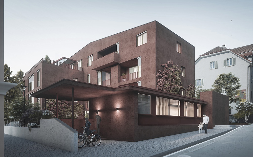 Der in der historisch gewachsenen, dichten Bebauung der Höttinger Gasse liegende Baukörper für 14 Wohnungen und eine Gewerbeeinheit ist aus einem, aufgrund dieser besonderen Lage notwendig gewordenen, geladenen Architekturwettbewerb (Juryvorsitz: Bettina Götz) hervorgegangen. Direkt entlang der Gasse positioniert, schützt der in Anlehnung an die Farbigkeit der historischen Stadt in rotem Beton ausgeführte Wohnbau den dahinterliegenden Hof vor Schall und Einsicht und erinnert durch die vorspringende Gewerbeeinheit an das kleine, abgebrochene Geschäftslokal.