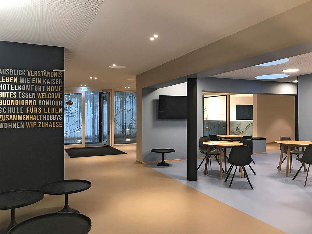 Im Inneren reihen sich die auf die Anforderungen junger Menschen abgestimmten Wohneinheiten entlang von gemeinsam nutzbaren Plätzen und Wegen aneinander, außen umhüllt eine einheitliche, transluzente Fassade die unterschiedlichen Funktionsbereiche. Großzügige Gemeinschaftsbereiche, eine überdachte Terrasse im 3. Geschoß und ein Innenhof im 4. Geschoß tragen dazu bei, dass die Jugendlichen hier ein attraktives Zuhause vorfinden.