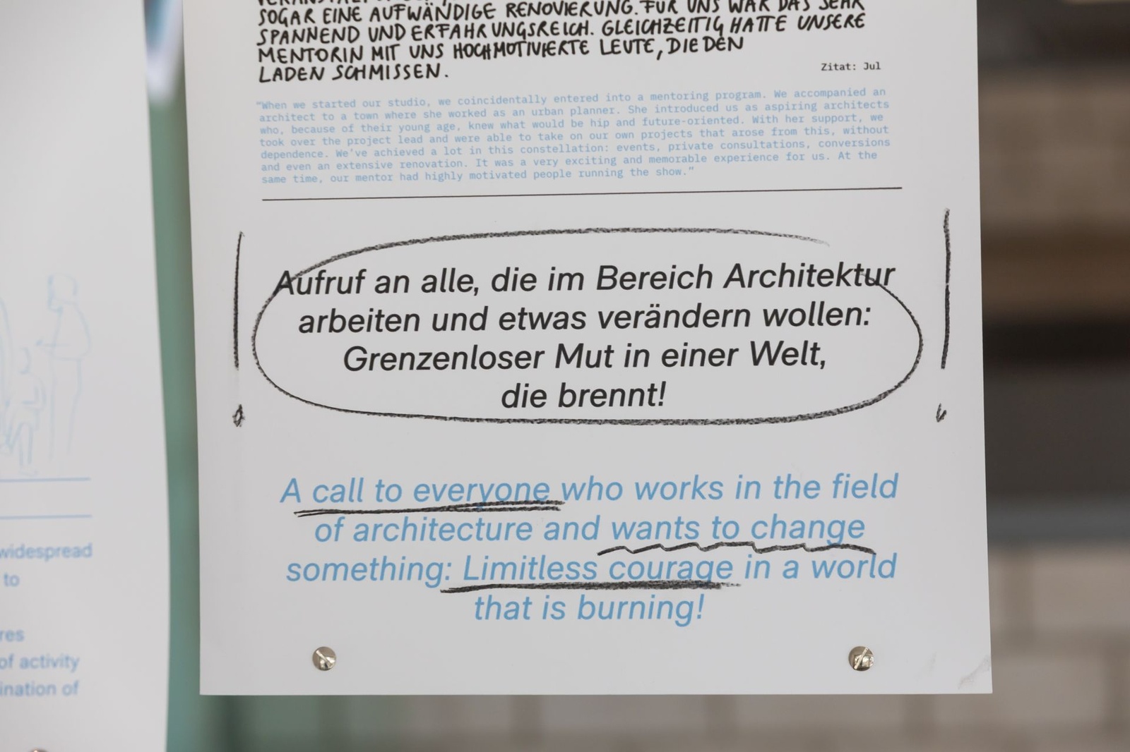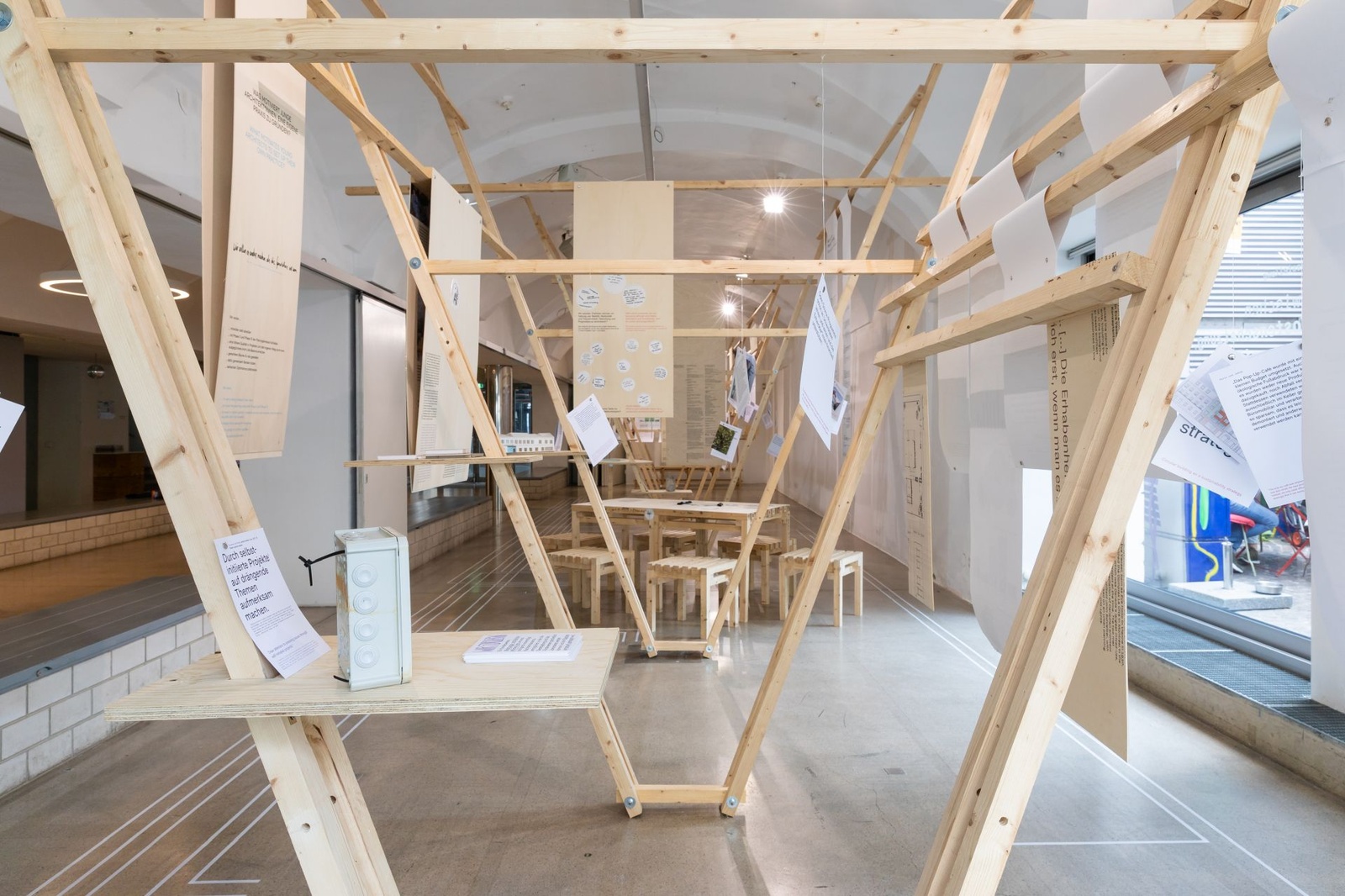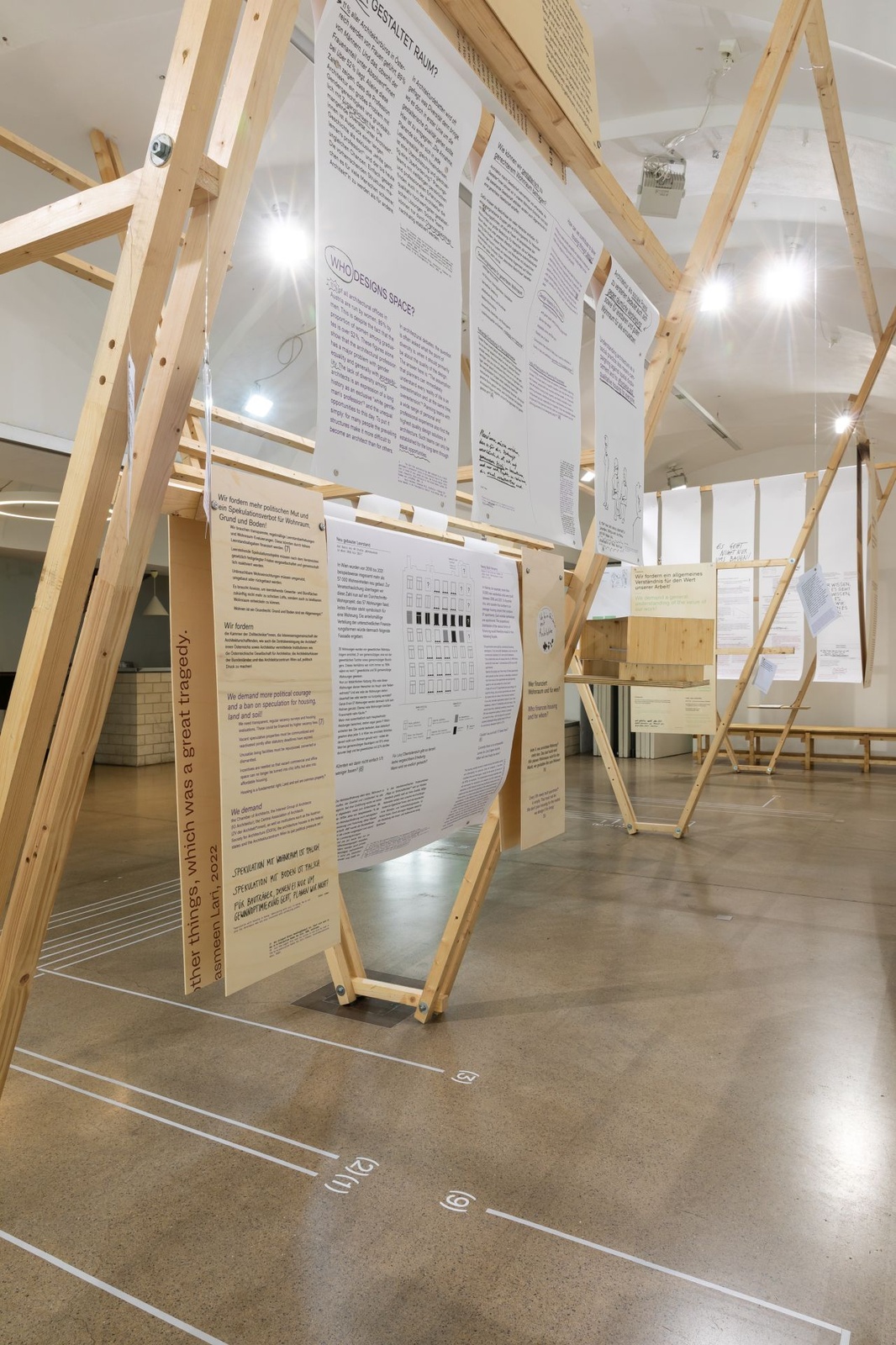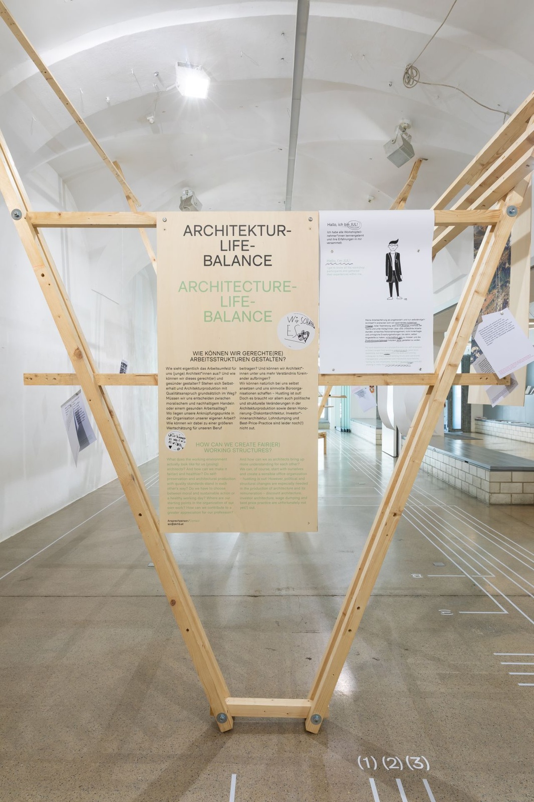 AusstellungDie Ausstellung „Zwischen Kostenschätzung, Muttermilch und Bauwende“ versammelt die drängendsten Fragen, Positionen und Forderungen junger Architekt:innen in Österreich. Die Herausforderungen sind groß: die Bauwende aktiv mitgestalten, gerechtere Arbeitsstrukturen schaffen und die eigenen Handlungsspielräume durch veränderte Rahmenbedingungen vergrößern. Gezeigt wird ein kollektiv kuratiertes Mapping, das gemeinsam mit 60 Architekt:innen erarbeitet wurde und den Auftakt zu einer offenen Diskussion bildet. Die Installation lädt zum Austausch ein, stellt Fragen und soll durch Kommentare der Besucher:innen weiter wachsen.