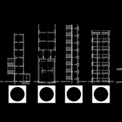 Raumhohe, eng gehängte Fahnen bilden die prägenden Elemente der Ausstellung. Sie sind mit Gebäudeschnitten im Maßstab 1:10 bedruckt und erzeugen, zusammen mit den rückseitigen Fotos, eine räumliche Dichte.