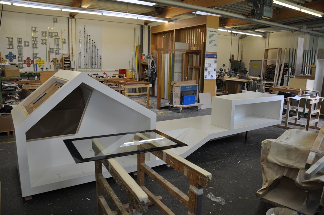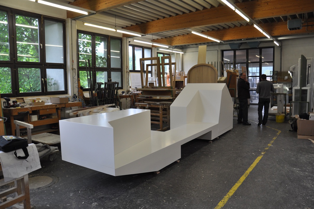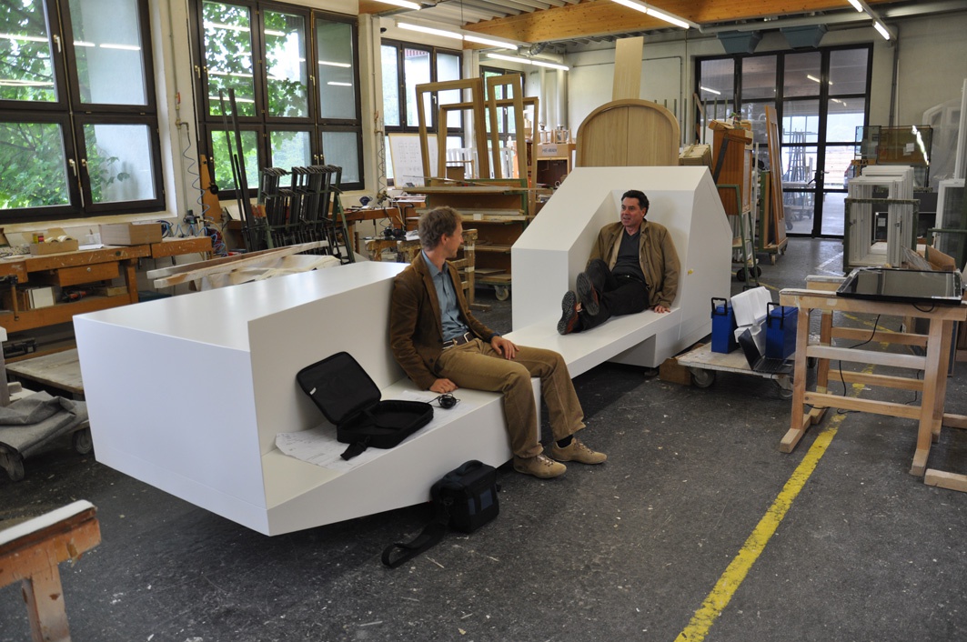Das mobile Objekt mit einer Länge von ca. 5 auf 1 m kommt wie ein Stadtmöbel daher, bietet aber noch viele andere Funktionen und in seiner Form das Thema Wohnen symbolhaft zum Ausdruck.