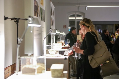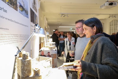 Gäste aus Kunst, Kultur, Architektur, Forschung, Wirtschaft und Design waren zur Eröffnung der Ausstellung „Circular Materials – Reststoff oder Rohstoff“ in Zusammenarbeit mit der FH Salzburg | Department Design & Green Engineering eingeladen .