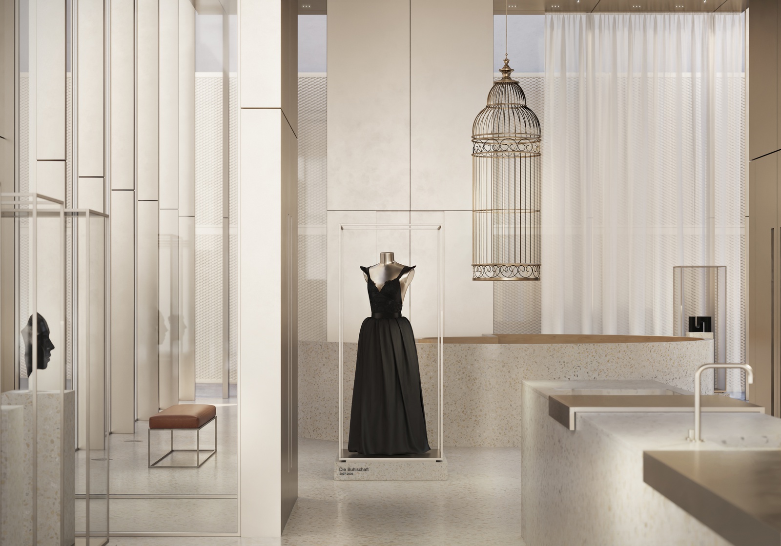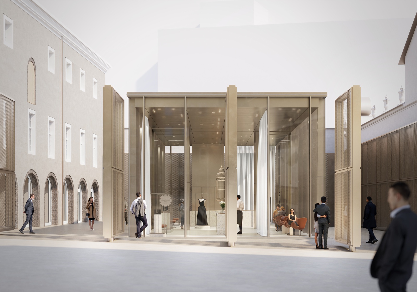 Im historischen Gefüge zwischen Prospektwand der Pferdeschwemme, Schüttkasten und Mönchsberg wird das neue Festspielzentrum realisiert. Dafür wurde ein in den 1980er-Jahren errichteter Anbau, das ehemalige Café Niemetz, abgebrochen. Monumentale, bronzefarbene Drehtore definieren den Eintritt in den Innenhof – das künftige „Festspielzimmer“. Ein freistehender, rechteckiger Glaspavillon fungiert als Informationszentrum mit Café und Shop. Die skulptural ausgebildete Wendeltreppe erschließt das Untergeschoss mit Flächen für verschiedenste Veranstaltungsformate. Insgesamt entstehen rund 755 m² neue Nutzfläche, eingebettet in das denkmalgeschützte Ensemble der Altstadt.