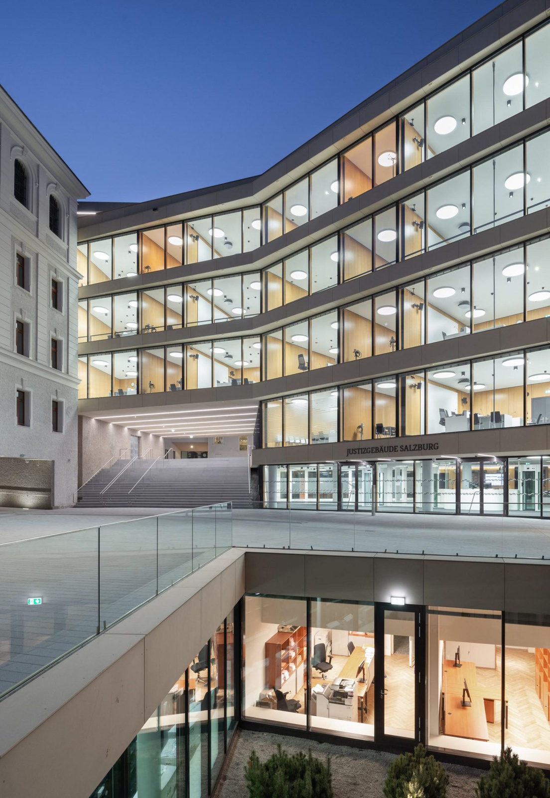 BesichtigungDer monumentale historistische Gebäudekomplex hat durch den Umbau eine neue Bestimmung erhalten. Voraussetzung dafür war die Verlegung des Gefangenenhauses nach Puch sowie die Entfernung von teils bauzeitlichen, teils späteren Hofeinbauten. Eingefügt wurde dafür ein Y-förmiger, transparenter Verbindungstrakt, der sämtliche Verhandlungsräume sowie den neuen Haupteingang enthält. Dieser Neubau erlaubt kurze Wege innerhalb des Gebäudes und bietet über sein Atrium, das alle Geschoße verbindet, eine optimale Orientierung. Mit der baulichen Erneuerung und der denkmalpflegerischen Rückführung des Bestands gelang ein wegweisendes Projekt. Durch die neu geschaffenen Zugänge und Passagen verzahnt sich das Justizgebäude mit dem heterogenen Umraum der Salzburger Altstadt. Als Highlight können BesucherInnen die weltberühmte Szenerie vom Dachterrassencafé aus genießen.