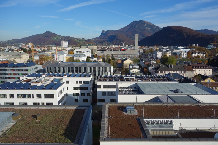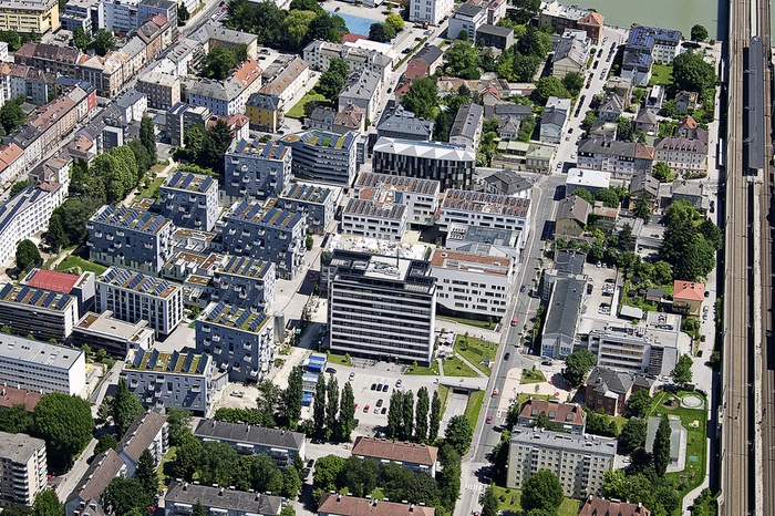 Die Geschichte des Stadtwerkareals als Ort der Gaserzeugung reicht bis 1857 zurück. Nach der Umstellung auf Erdgas begann 2000 der Prozess der Nachnutzung, der 2006 in einem städtebaulichen Architekturwettbewerb mündete, den transparadiso mit Bernhard Vlay gewann. 2009 startete die Bebauung in zwei Teilabschnitten: Die nördlich gelegene Wohnbebauung mit 287 geförderten Wohnungen ist seit 2014 bezogen und hat aufgrund ihrer Dichte und Höhe für mediale Aufregung gesorgt. Nun ist auch der 2. Bauabschnitt mit Forschungs- und Bildungseinrichtungen weitgehend fertiggestellt und das Stadtwerke-Hochhaus von 1968 revitalisiert. Grund für uns, das gesamte Areal einer Besichtigung zu unterziehen. Wir starten auf der Dachterrasse mit der Einführung und wandern anschließend in zwei Gruppen durch das Areal. Zum Abschluss lädt der Standortentwickler PRISMA zu einer Jause in der Trumerei