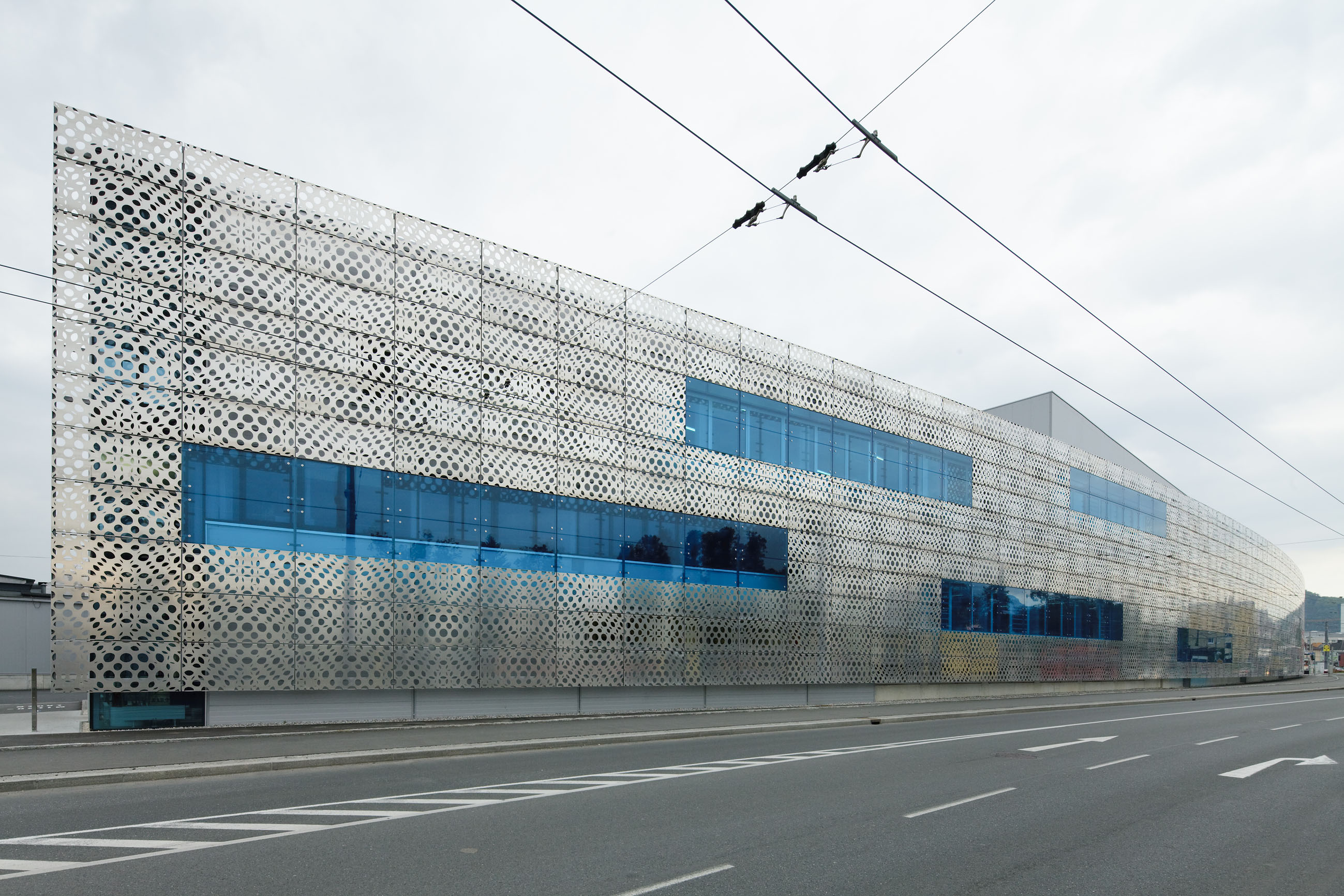gharakhanzadeh sandbichler architekten planten den Neu- und Umbau für den wachsenden Molkereibetrieb Alpenmilch Salzburg. Der neue Trassenverlauf der Schillerstraße ließ eine Freifläche entstehen, auf der die dringend erforderliche Erweiterung bewerkstelligt werden konnte. Kernpunkt des Konzeptes war es Signale der Aufgeschlossenheit und Transparenz nach außen zu senden und dennoch die lärm- und geruchsintensiven Produktionsabläufe von der Umgebung abzuschirmen. Dieses antagonistische Prinzip vermittelt die teiltransparente Fassade aus unbehandeltem Aluminium des Künstlers Peter Sandbichler. Sie weckt Assoziationen zu Begriffen wie Transparenz, Hygiene, Technologie und Automatisierung (Partner Wettbewerb bis Einreichung SHIBUKAWA EDER).